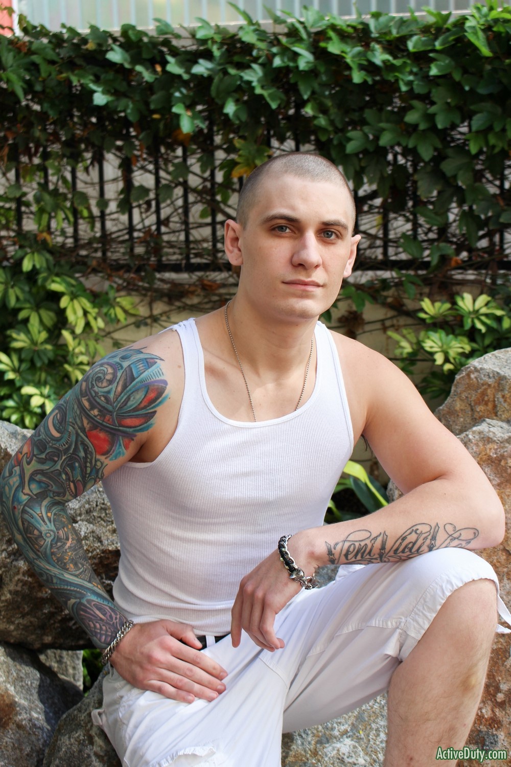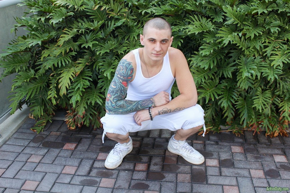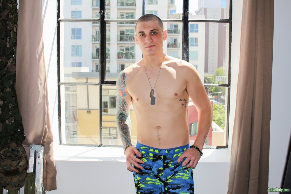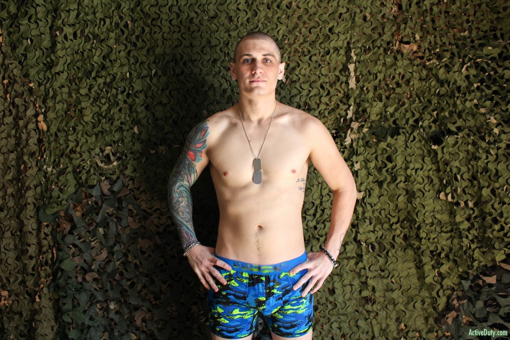 Active Duty released a hot new scene today. Alex Michaels has a full inked up sleeve that is beautiful in color and he's being deployed real soon so we had to give him a chance at showing us what he's got. He's got a mean look to him but also a fun sweet caring look as well. Alex pulls his beautiful thick cock out and starts stroking every inch of it. It grows to a very nice length and I'm sure we would all love to see it in a tight ass.