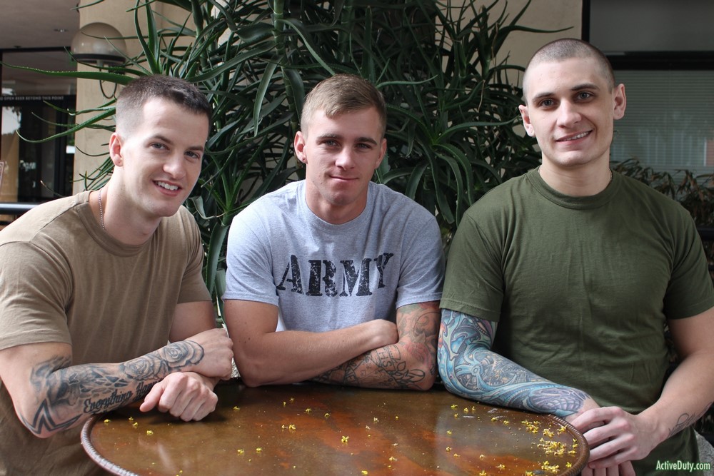 Quentin takes a back seat and lets Alex fuck Ryan's ass for the very first time. Alex can't believe how great a man's ass feels as he is balls deep in Ryan. Alex lets Quentin finish Ryan off as he stuffs his dick into Ryan's mouth and watches Quentin pound deep into Ryan. These soldiers balls are built up as one by one they nut all over Ryan leaving him with jizz all over his face and ass which makes him blast his load all over the sheets.