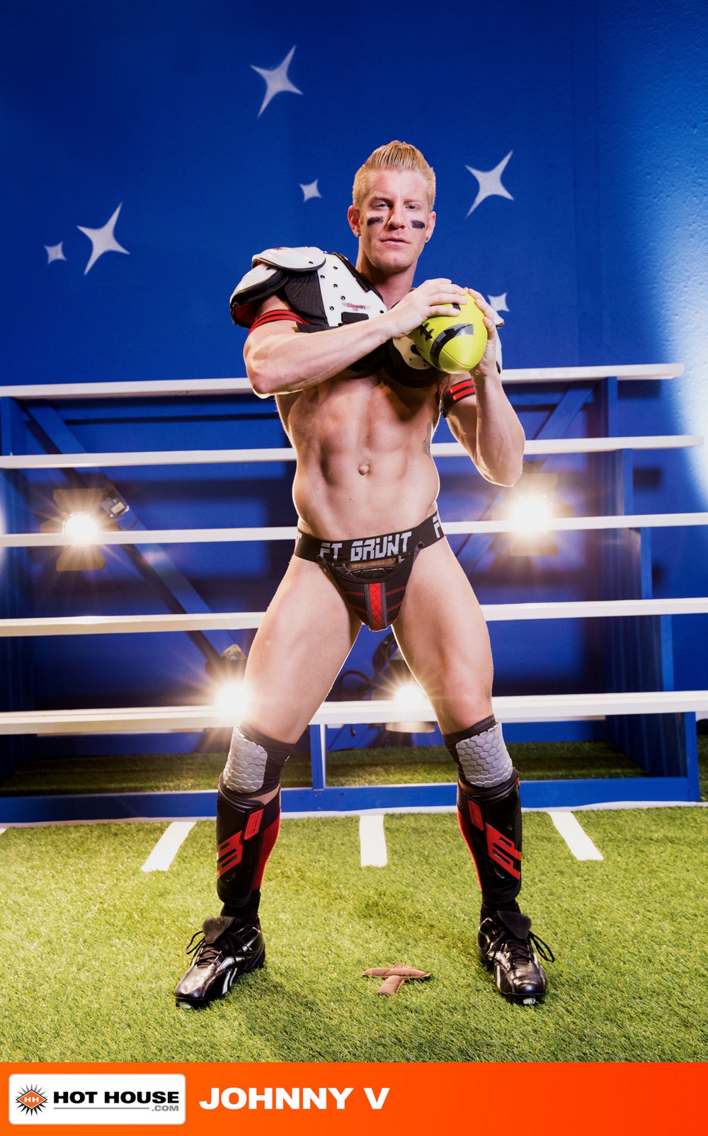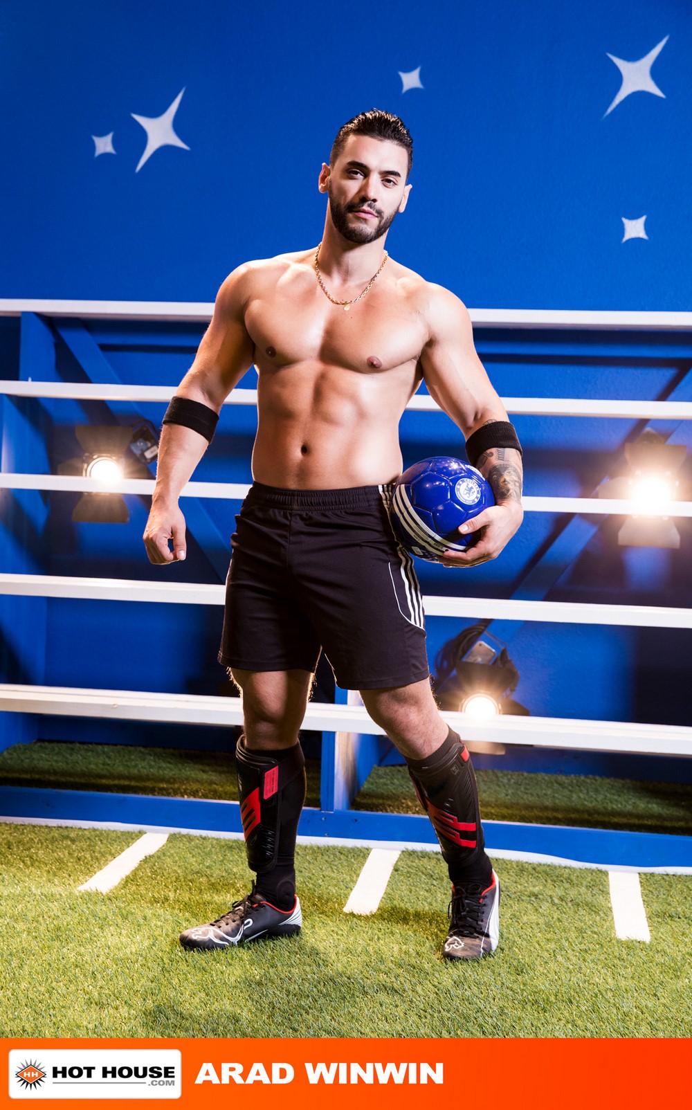 Go hard or go home at Hot House! These nine horny athletes from three different sports love to suck and fuck in their gear! Sit back and watch their ‘Gear Play’ as they peel off sweaty jockstraps, get their balls played, show off their dripping muscles, and blow off steam from rough games and long, hard practices for their coach/director Nick Foxx. On the soccer field, Johnny V gets between Arad Winwin's legs to explore his massive bulge. When the studs get out of their shorts, Arad gives his teammate a pounding that leaves Johnny drenched with jizz.