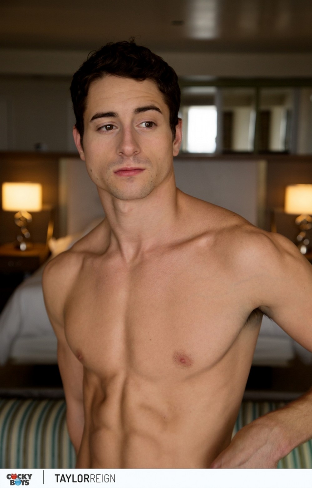 In a series of almost seamless transitions Arad moves from rimming Taylor to sucking his cock, getting into a tight 69, and standing up Taylor to play with his butt once before turning him around to sit on his cock in a cowboy position. Taylor's perfectly shaped ass and impressive v-taper are on full display as he rides Arad who thrusts up to meet his bounces. And in another smooth move they kiss again and Taylor is on his back getting Arad's cock in missionary position...with a few variations. They're totally focused on each other with their eyes and mouths reaching one more transition.