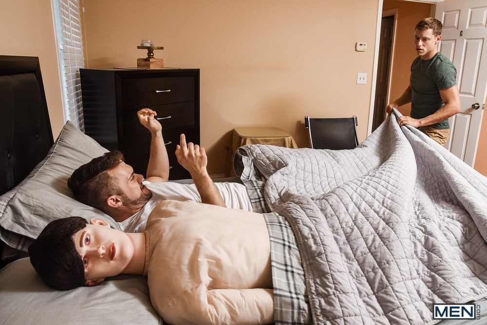 Gay porn mega site Men.com‘s sub site Drill My Hole released “When the Top's Away” today. Dark-haired Blaze Austin decides to play a prank on his chiseled boyfriend, Justin Matthews. The tanned stud is on his way home from a work trip and buff babe Blaze sets up an elaborate scheme to make it seem as if he’s cheating. Justin comes home and finds blue-eyed Blaze in bed with none other than a dummy! He’s both shocked and happy at the same time, and what better way to get back at his boyfriend than by fucking his juicy bubble butt with his big dick.