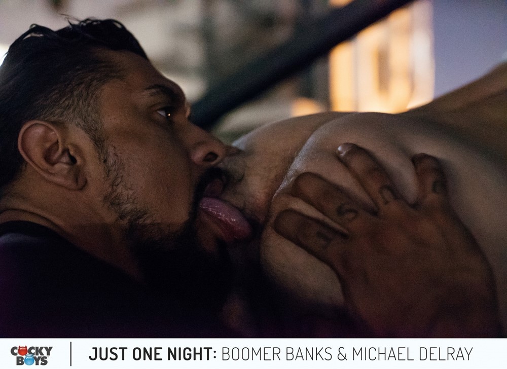 CockyBoys released “Just One Night” part 4 today. Boomer Banks heads home after a hot party but he's sure not ready to call it a night. Neither is Michael DelRay. They're both on the prowl, crossing paths at an unlikely spot, exchanging lusty glances and drawing closer. After a few grazing gestures, Boomer takes Michael by the hand to a fire escape outside his building. There they make out and Boomer boldly sucks Michael's cock before taking him up to the roof to suck him more and rim him. At the highest roof level they kiss and gaze at the cityscape, but Boomer gets to the point with dead seriousness: "Do you want to stay here and watch the view or do you wanna go fuck?"