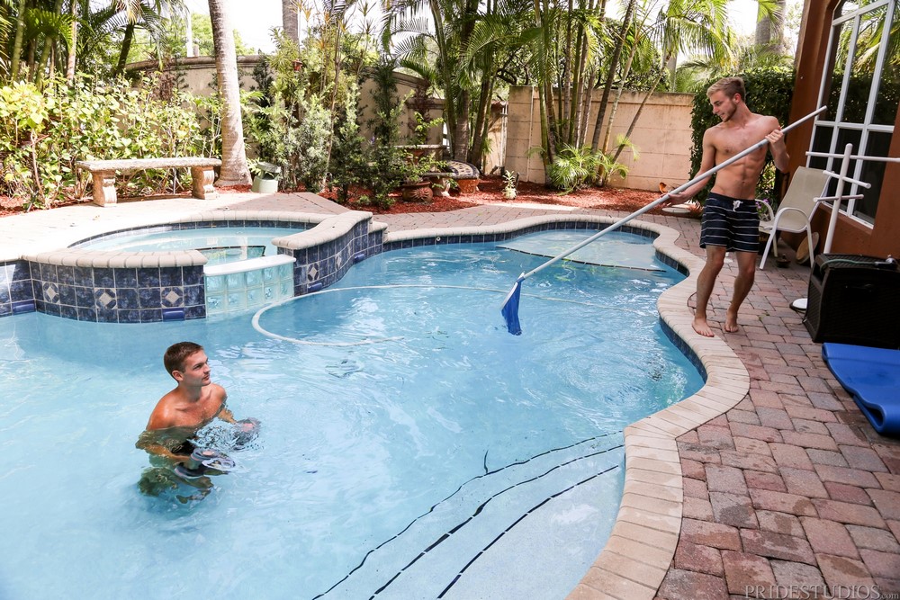 Pride Studios released their new scene "Afternoon Delight" today. Conner Mason is in the pool working on some workout techniques when Seth Stark comes outside and begins to clean the pool. Seth joins Conner in the pool and they start to kiss. The pool isn't as warm as it should be so they continue the kissing poolside where Conner begins to blow Seth.