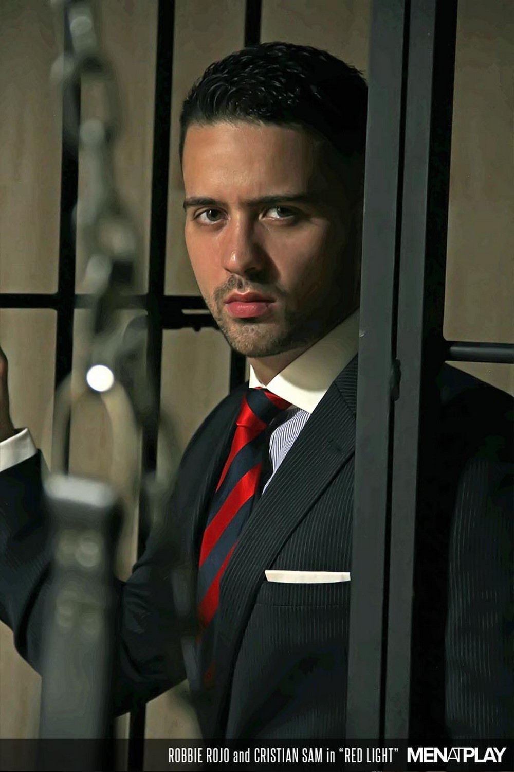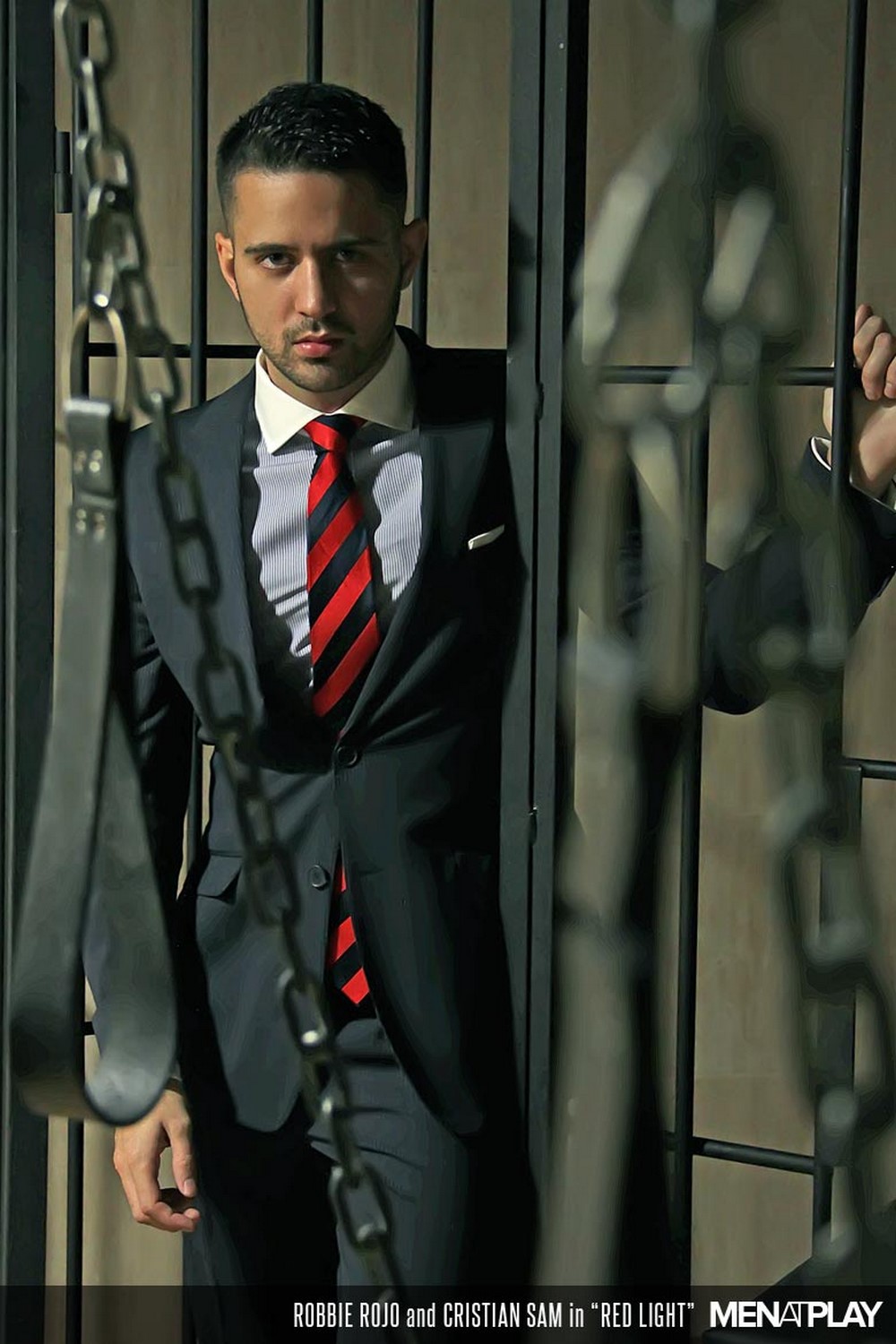 These two hot guys are on the prowl in a sex club, all dressed up in slick suits and ties, throwing each other lustful looks and sharing cigarettes. In the dim red glow, not even metal bars can stop these horny studs. They kiss and grope each other until their suits come off, and Robbie reveals a leather harness. Combining two fetishes—suits and leather—is just the start of this hot fuck session.