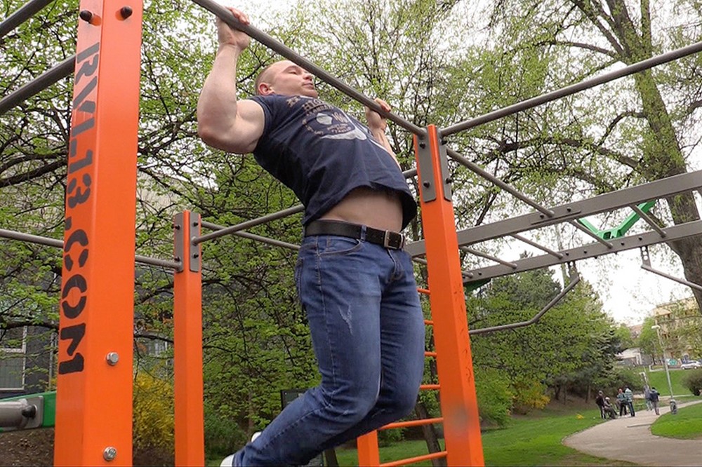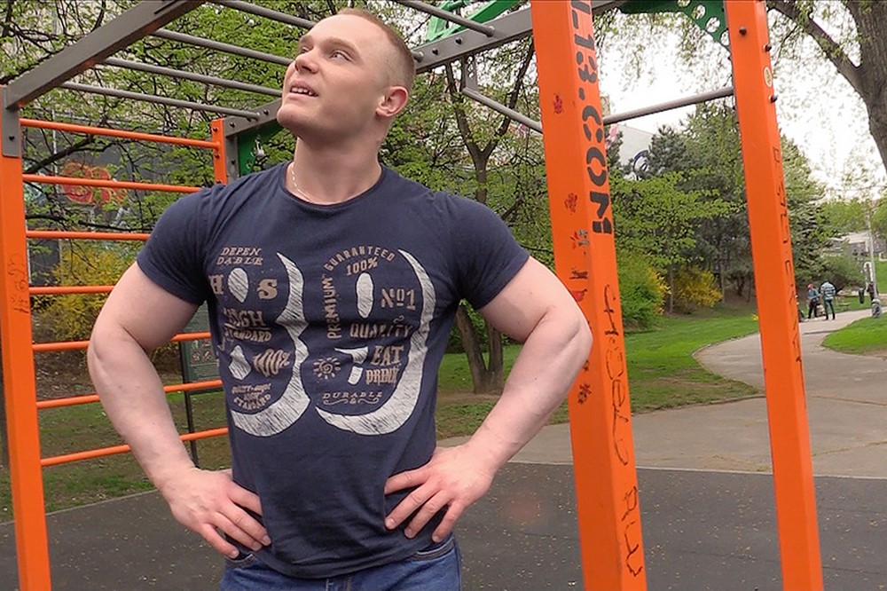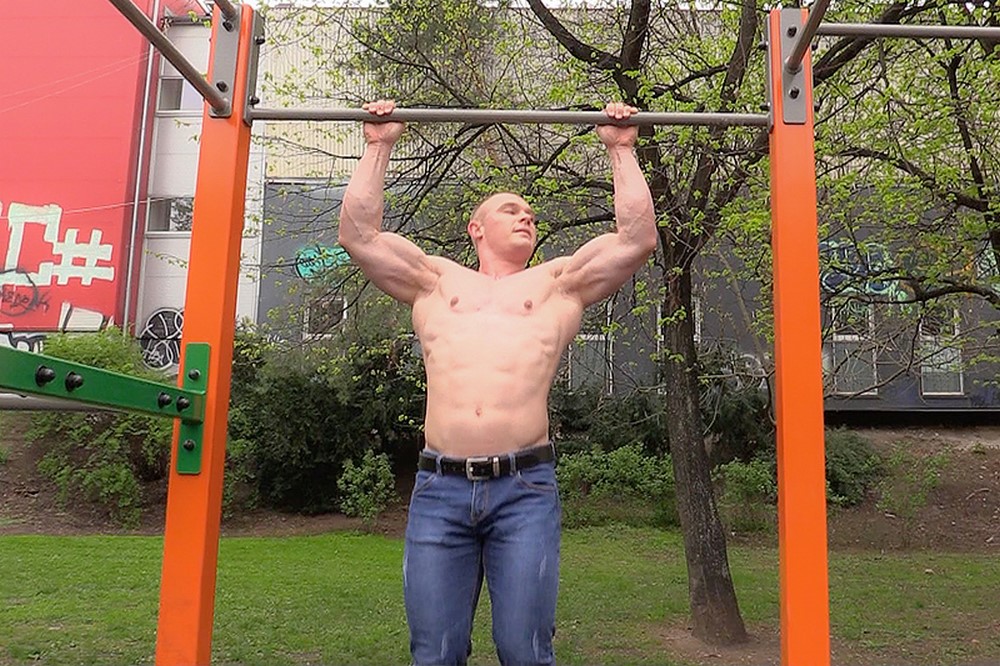 Half-naked, of course. The boy was a bodybuilder hence the view was simply gorgeous. All those pull-ups made me terribly horny. I just didn't want to make him angry with some inappropriate proposition. Then he told me about his financial problems and I offered him a nice way to solve them. I was lucky because the guy was very open-minded, I think he even had a gay experience. Or maybe he liked me, who knows.
