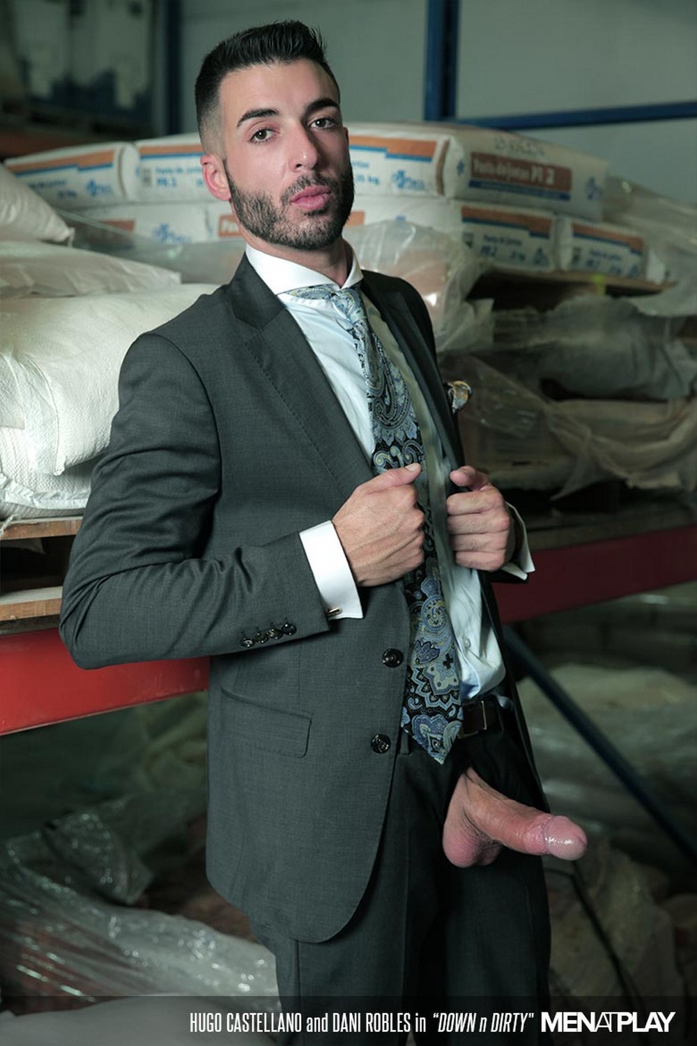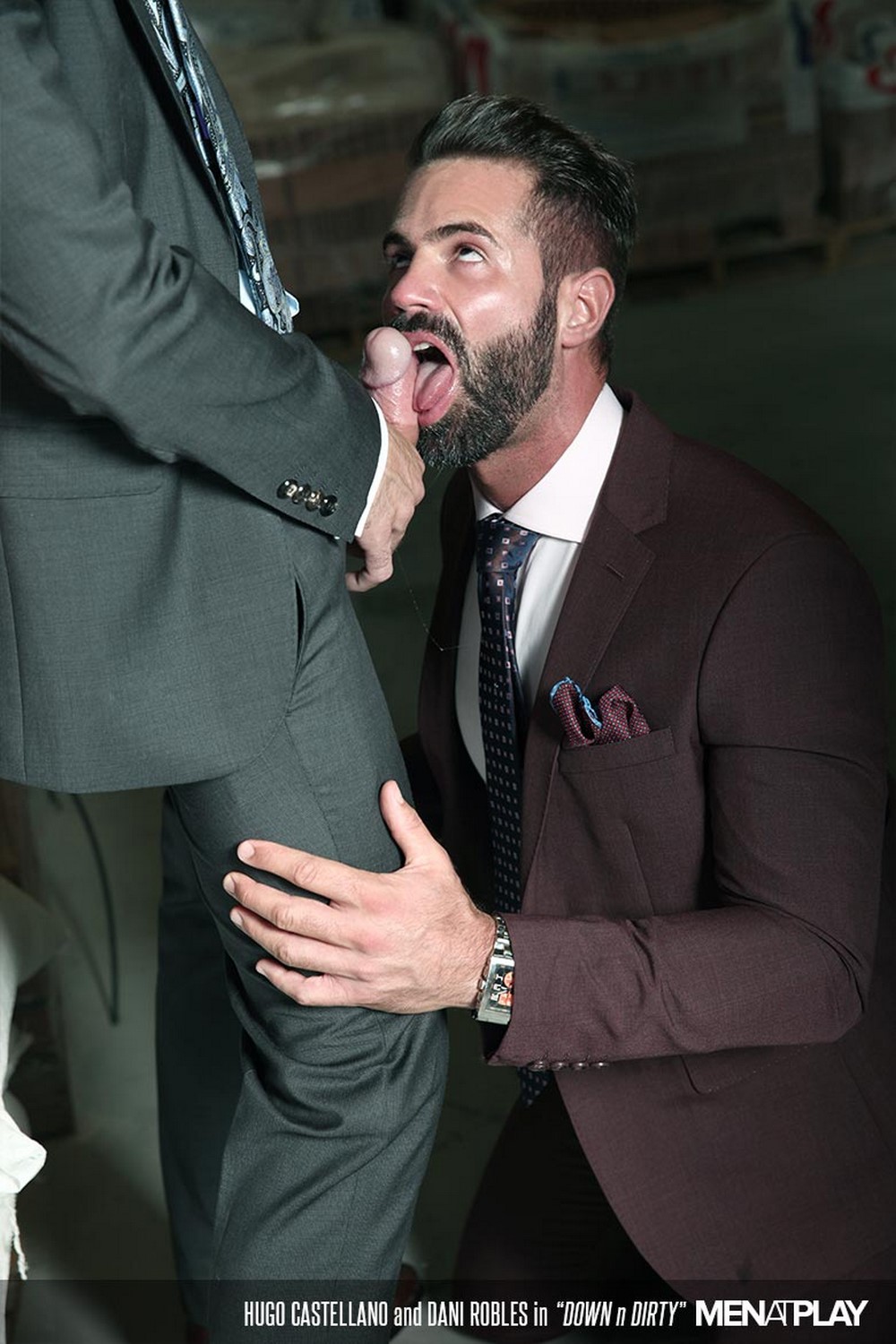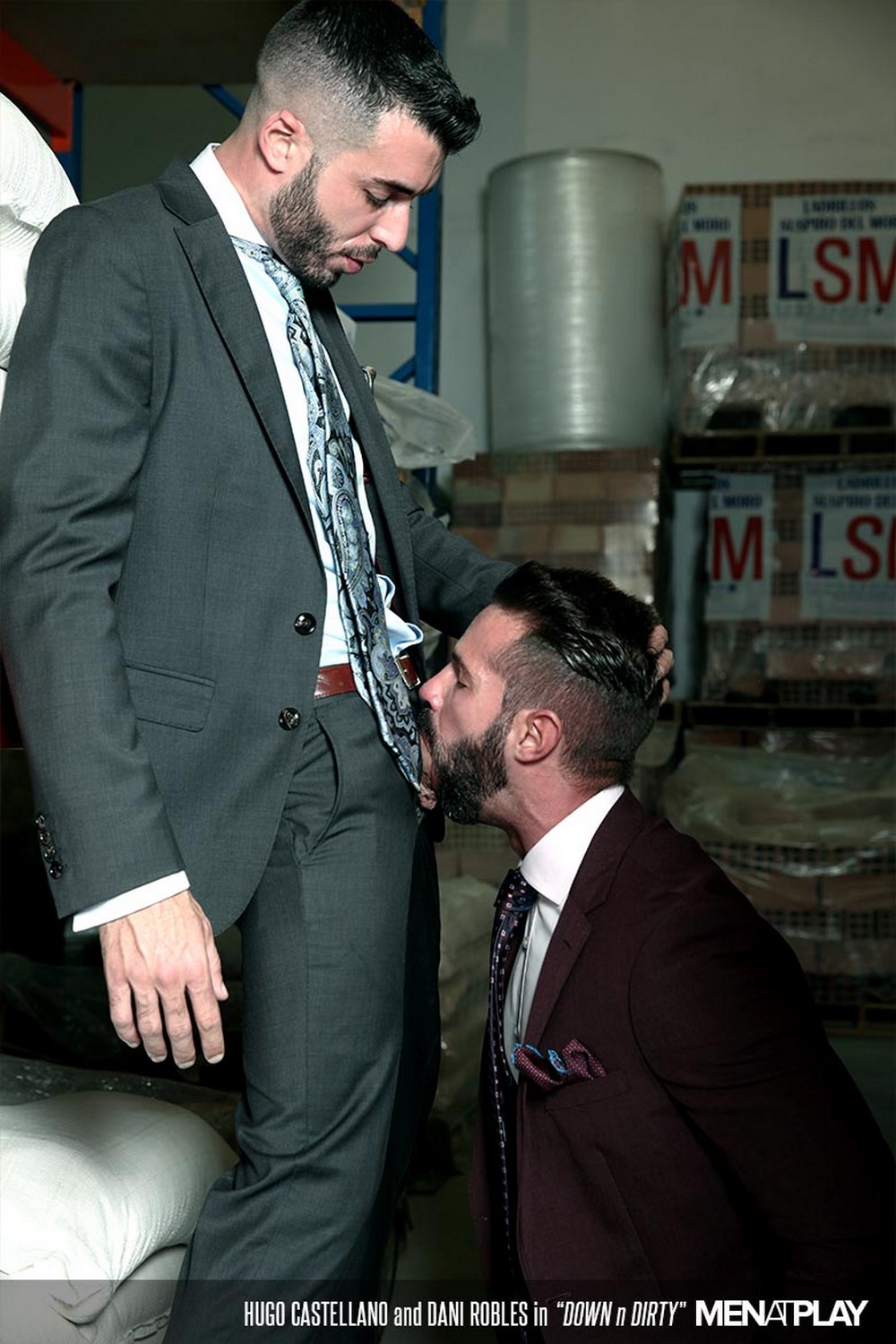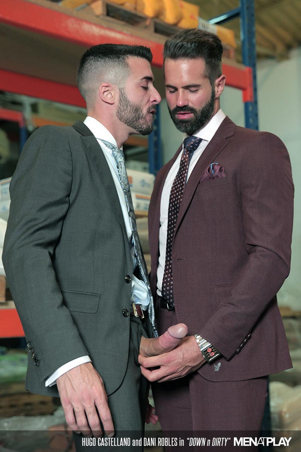 Secret fuckers have few options. Dani and Hugo—both stylish in suits and fit their physiques—opt for a warehouse where they work. Once they both arrive, it takes no time for them to get down to rough kissing and sloppy blowjobs. Hugo sports one of MAP’s largest cocks. Dani, a pro when it comes to big dicks, has no problem deep throating Hugo’s meat. Then it’s Hugo’s turn to thrust and swirl his tongue up Dani’s gaping hole. He practically buries his face in Dani’s taut ass.