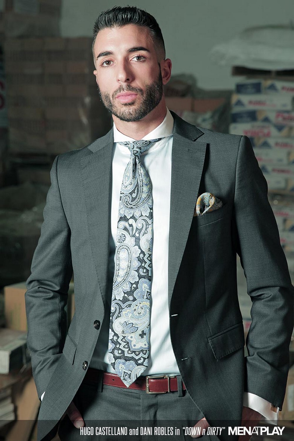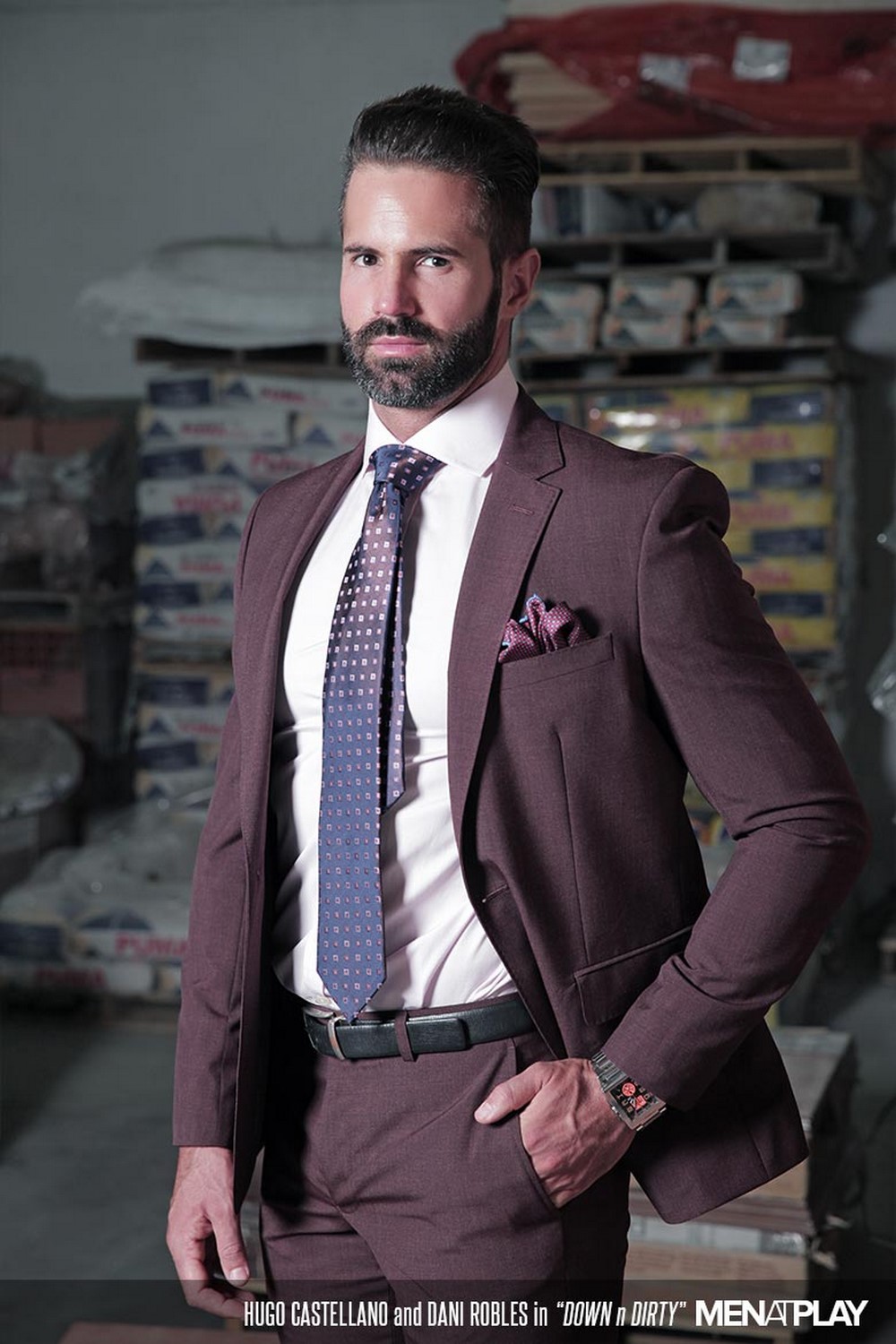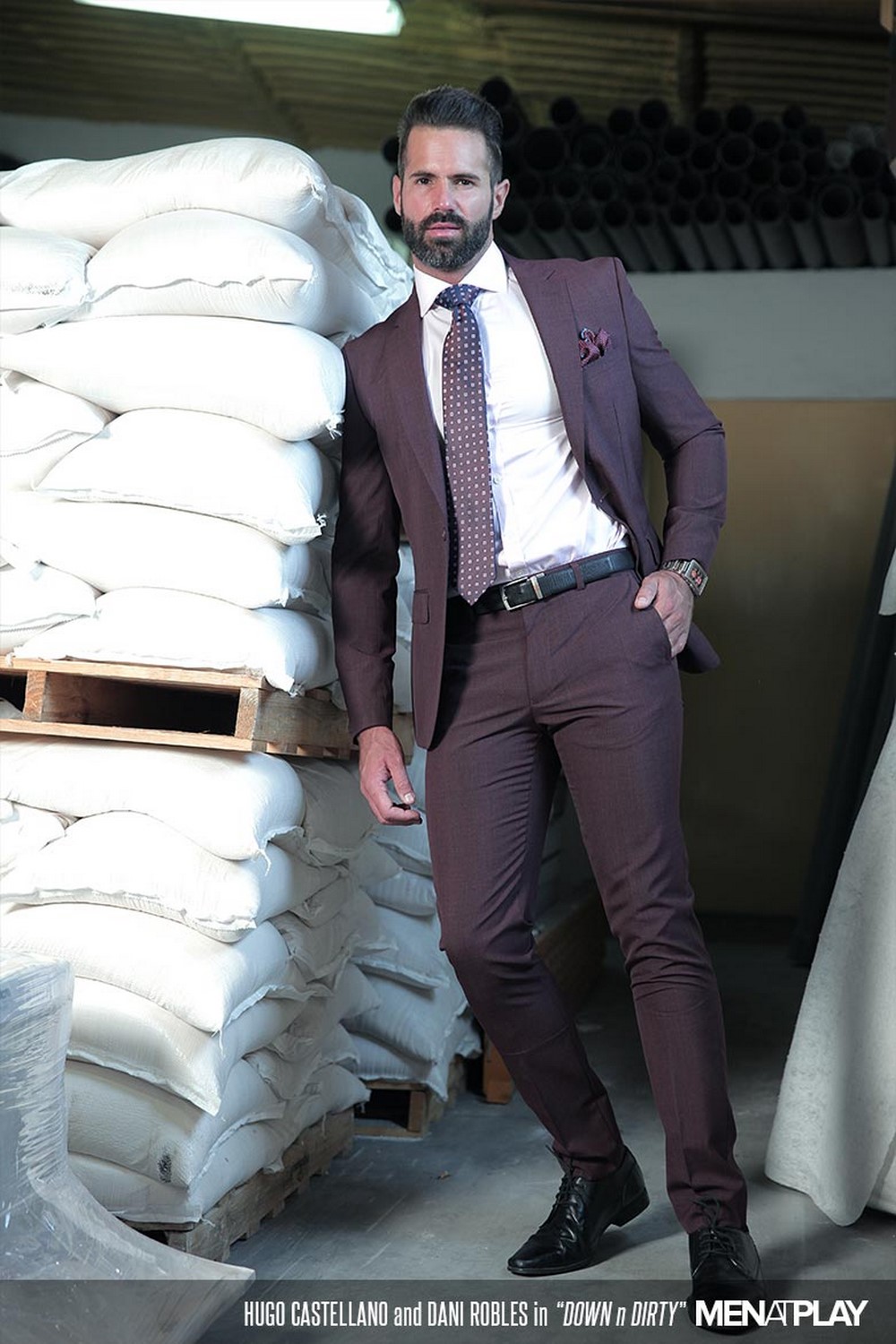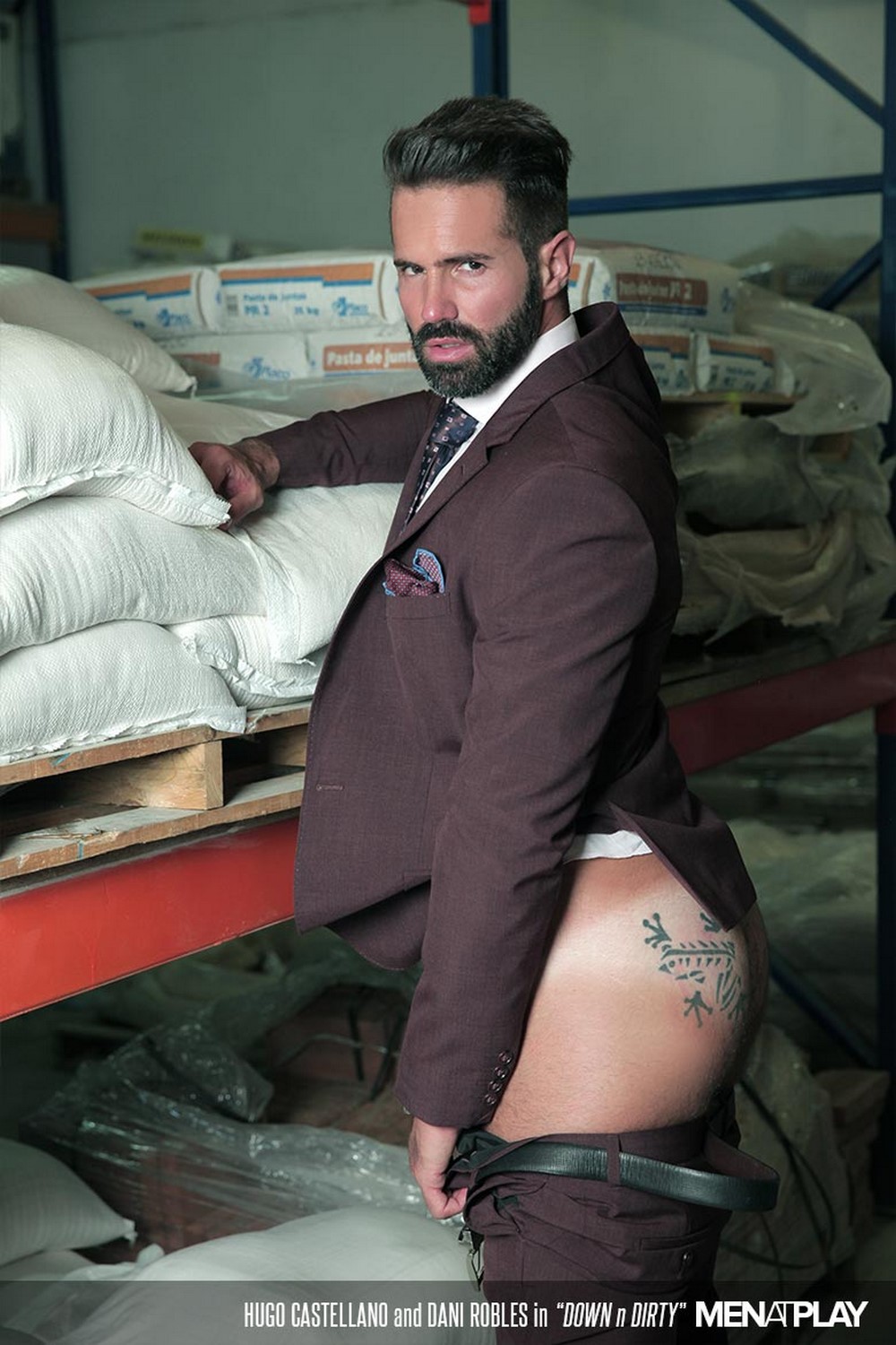 Secret fuckers have few options. Dani and Hugo—both stylish in suits and fit their physiques—opt for a warehouse where they work. Once they both arrive, it takes no time for them to get down to rough kissing and sloppy blowjobs. Hugo sports one of MAP’s largest cocks. Dani, a pro when it comes to big dicks, has no problem deep throating Hugo’s meat. Then it’s Hugo’s turn to thrust and swirl his tongue up Dani’s gaping hole. He practically buries his face in Dani’s taut ass.