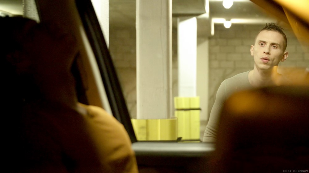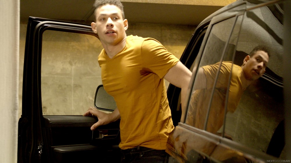 Next Door Raw released “Places to Fuck” today. Walking through the parking garage on the way up to his apartment, Dante Martin thinks he sees what appears to be David Strong struggling in his car, perhaps having some kind of medical issue. As he approaches the car, it turns out that the guy inside is merely jacking himself off, but he stops suddenly when he turns and sees Dante. Dante frantically panics and runs off up to his building. The man exits his car and follows just a few moments behind.