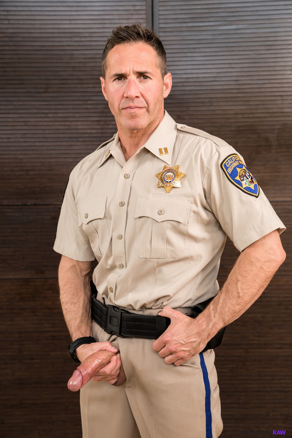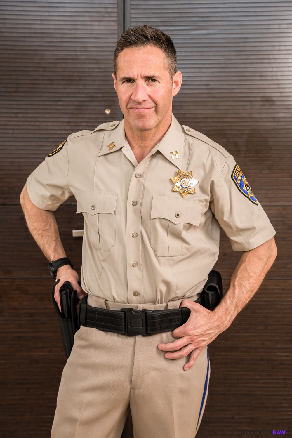 Dean fucks Lance hard, meting out some 'street justice' and Lance takes it like a champ, riding Dean's nightstick and stroking his load all over the cop's chest, as Dean pulls out and spits his load all over Lance's face, and Lance drinks it dry as Dean dips his cum-dripping cock into Lance's mouth- a facial courtesy of the long arm of the law. Lance tells Dean he has no problem if the Sheriff decides further interrogation is necessary.