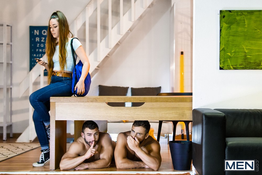 Gay porn mega site Men.com‘s sub site Drill My Hole released a new hot scene, called “Mind Blown”, today. Diego Reyes hits up Logan Moore for a quick suck and fuck once his girl leaves him for the night. The studs waste no time in getting down to business but have to play it cool when she unexpectedly shows back up. Can they keep their moans lower than her music?