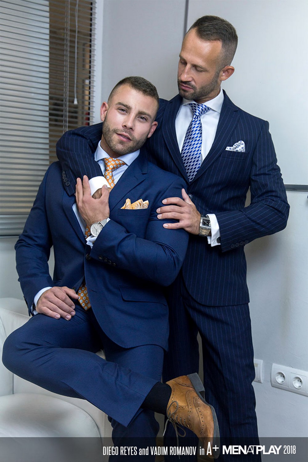 Vadim has a lean build that was made for suits. The blue pinstripe suit he sports get worked out as much as his dick and Diego’s plump ass. Wait until you see Diego ride Vadim’s dick while spurts of hot cum glaze Vadim’s trousers. And Vadim adds his own spunk, drenching that fine suit in cum. This video will certainly give you an education.