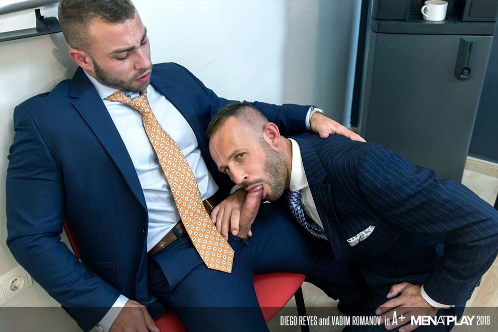 Men at Play released “A+” today. Teaching is stressful work, especially when you’re a guy who’s horny for suits, ties, shiny dress shoes and the sexy men who wear them. Diego Reyes and new Men at Play stud Vadim Romanov take out their classroom frustrations on each other this week in A+.