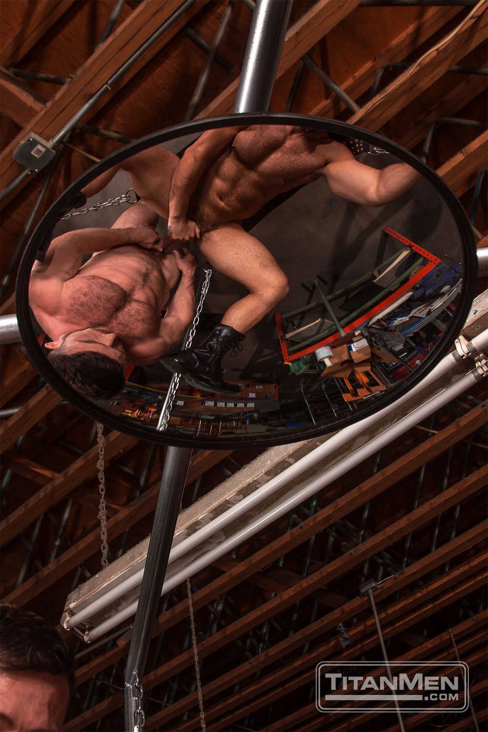 Eddy then offers his ass in the sling, gripping onto the chain as he gets owned (“You like that dick?”). The excited stud gets on his back, yelling “Keep fucking m! e! Fuck me hard!” as he strokes out his load, his sac sliding against Liam’s hairy groin. Liam then dumps his hot load all over the bottom’s cock.