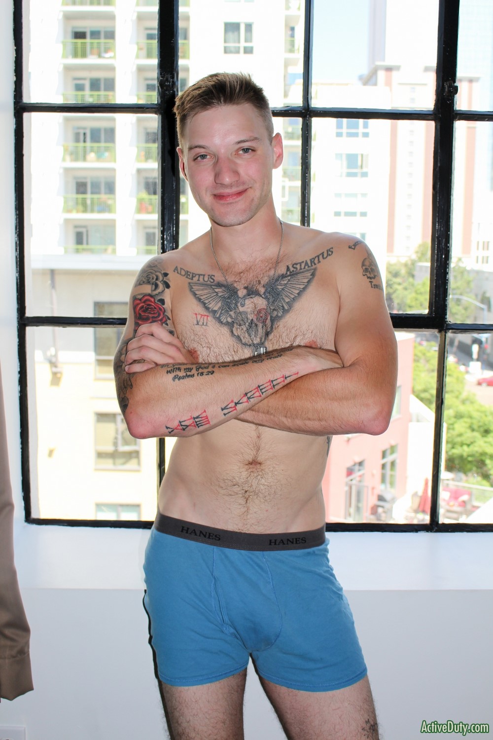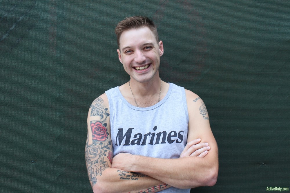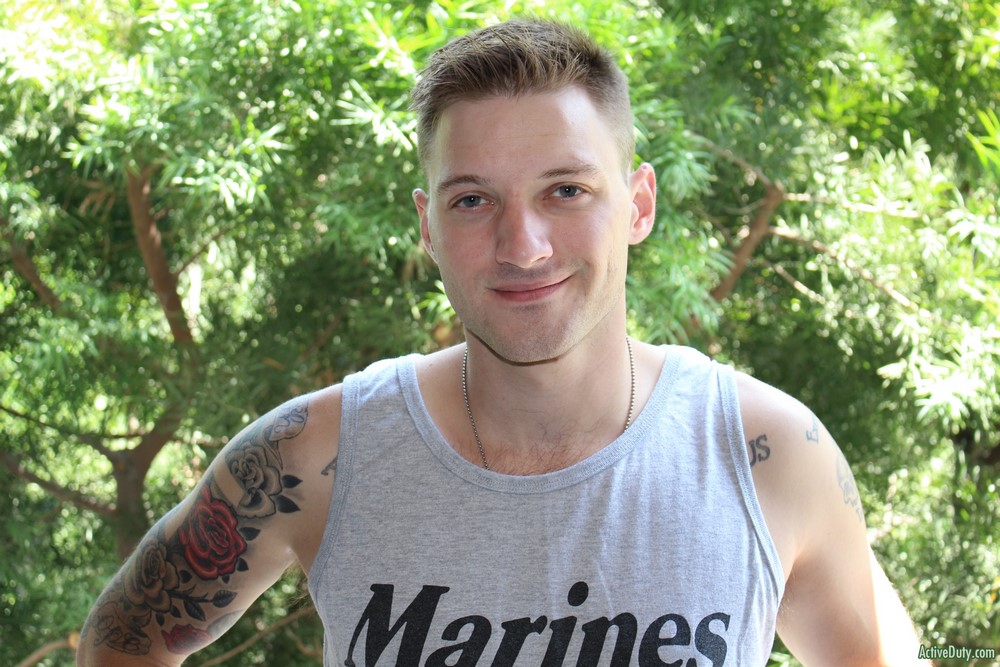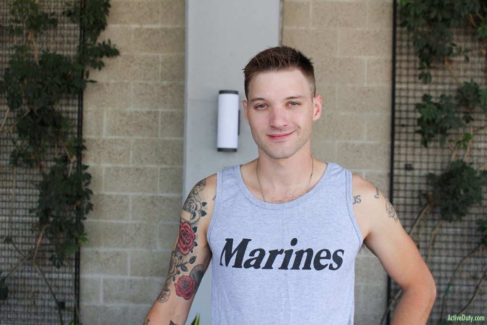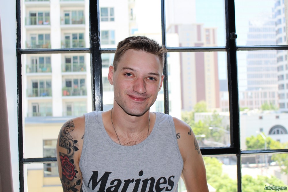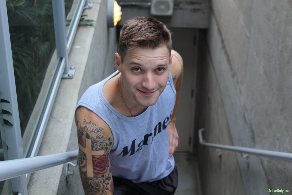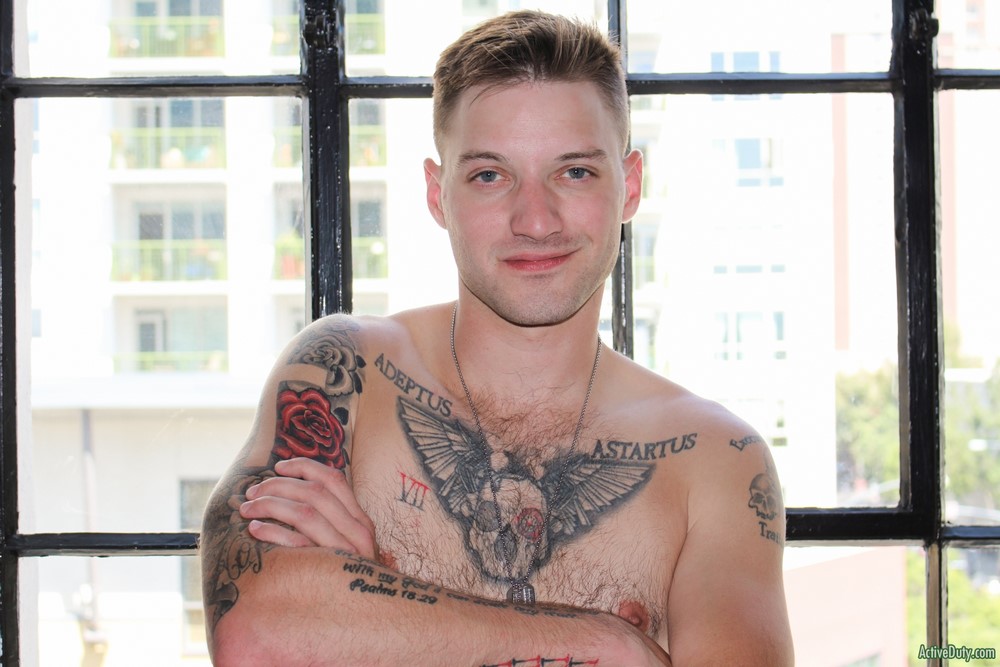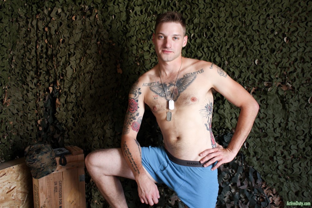 Active Duty released a hot new scene today. Jaxon D has a nice demeanor and he's always smiling and laughing. He can't stare at the camera for too long or he starts to giggle at himself. Jaxon begins to warm up his very nice cock and once it's hard in his hands you can see just how lengthy it is. He has some sexy ink on his chest as he rubs himself while stroking that hard dick.