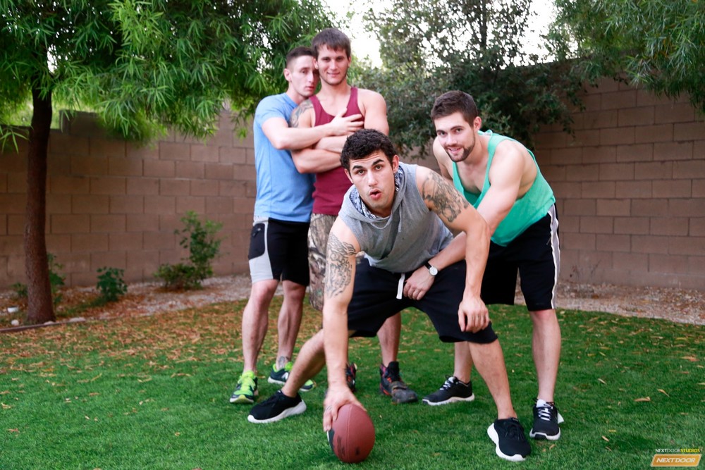 Next Door World released "Caught Cock-Handed" today. After a day of tossing the old pigskin around, Jimmy Clay and Griffin Barrows are ready to for a different kind of ball handling. Unbeknownst to Allen Lucas and Lance Ford, they've slipped upstairs to take a mutual timeout. Lance and Allen notice they've been missing for a while, and Allen volunteers to see what's up, making his way up the stairs before stopping suddenly at the sight of Griffin on his knees, deep throating Jimmy's hard cock. Allen creeps to the doors edge and takes a peek, feeling his dick get hard underneath his shorts.