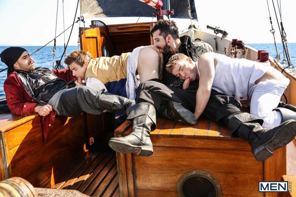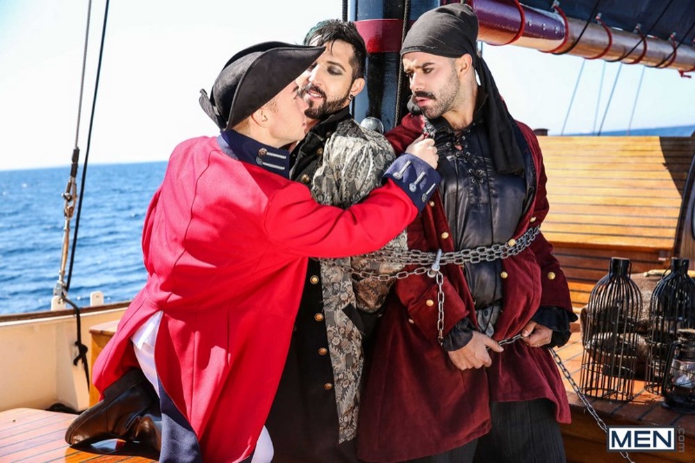 Gay porn mega site Men.com released the third scene from their mini-series, called “Pirates : A Gay XXX Parody“ today. Johnny Rapid learns the dangers of the cursed treasure he wears around his neck. Once “rescued” by Paddy O’Brian and Gabriel Cross, he learns of their true motives. He assists Jimmy Durano and Teddy Torres in tempting Gabriel Cross to get them out of their current predicament, seducing the captain’s guard with some good ole fashion pirate pillaging.