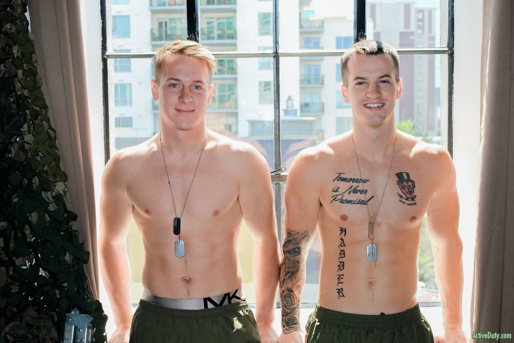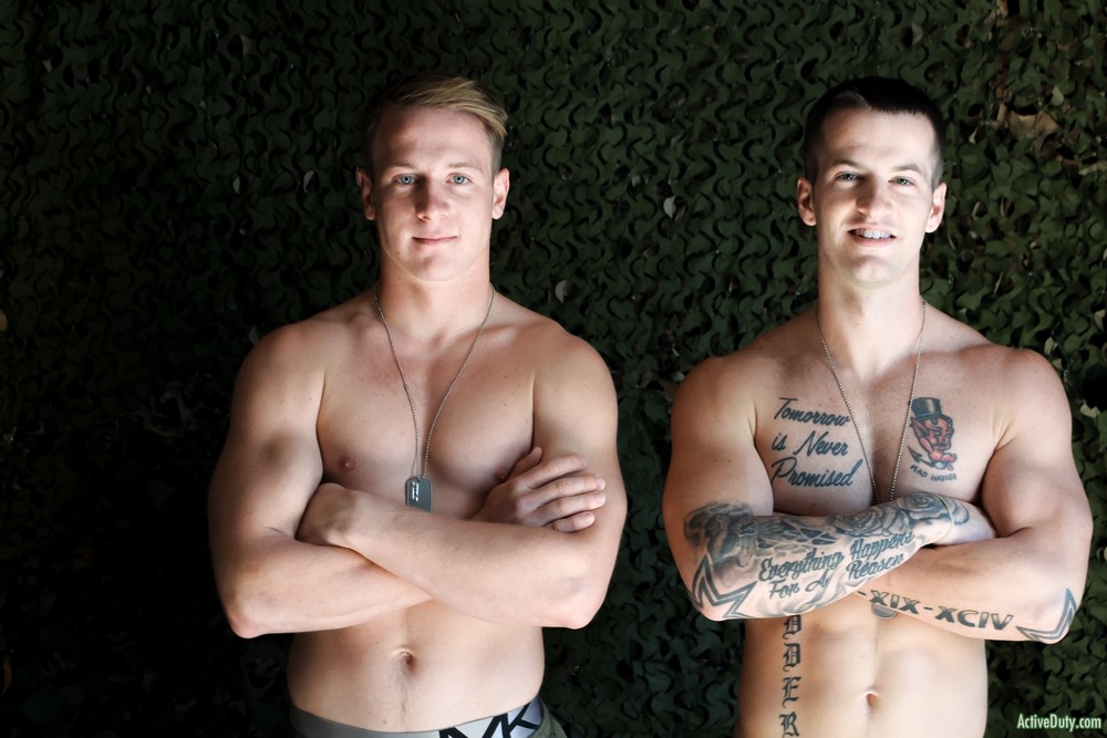 Active Duty released a hot new scene today. The boys have just finished working out and now they are checking each other's fit bodies out in the mirror. They both compliment one another as they move around the room flexing their legs, arms and asses. Soon enough they are both horny from looking at their ripped bodies in the mirror. Kevin Grey jumps onto the bed and Quentin Gainz jumps onto his cock with his eager mouth and starts deep throating his shaft.