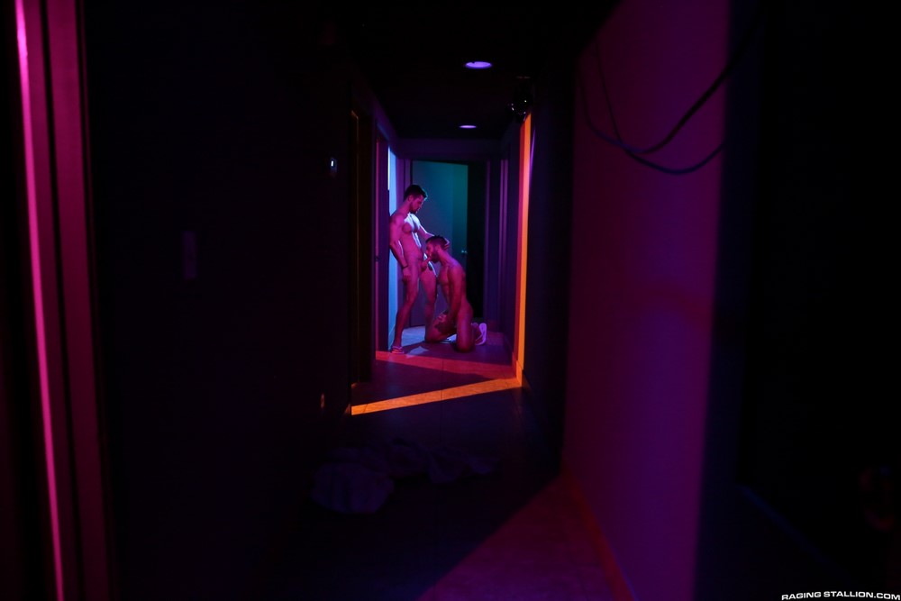 Raging Stallion‘s new and hot movie, directed by Steve Cruz, and it is called “Clothing Optional”. Take the tour with 8 hung and horny hunks that will do anything they can to get some cock or a tight piece of ass. Anything goes here, and everyone is guaranteed to leave with their balls completely drained. in Part 5 Kurtis Wolfe and Hector de Silva rendezvous in the hallway. Without hesitation, Hector services Kurtis' curved cock and gets his lips and beard covered in cum.