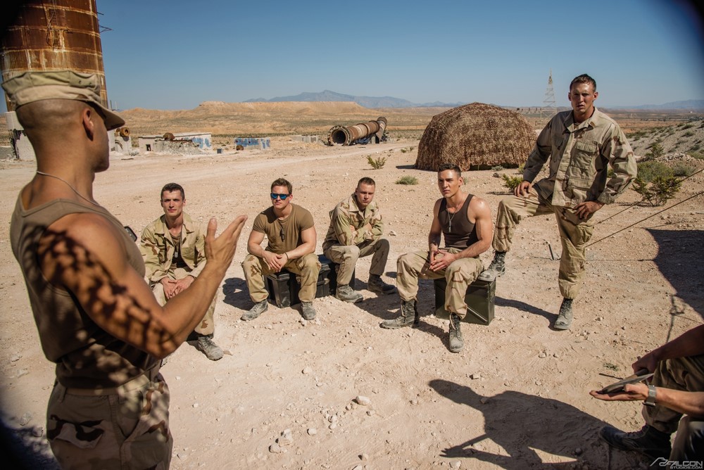Falcon Studios has released part 4 of their new “Code of Silence” movie today. Kyle McMillan has a camera and he's sneaking up on Pierce Paris in his tent on the military base to see what Pierce is up to. Kyle is in for a surprise when he finds his buddy fully immersed deep inside a FleshJack. Pierce pleads for privacy but Kyle insists that there's no such thing in the military. Kyle offers up some help and when Pierce has his eyes closed, he slips the FleshJack off of Pierce's stiff dick and starts using his hands and mouth.
