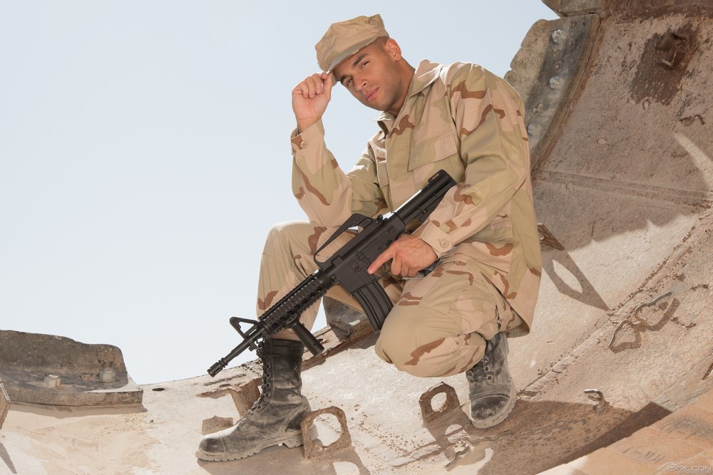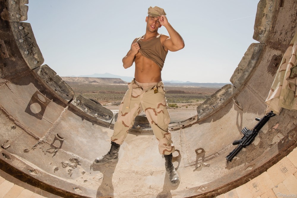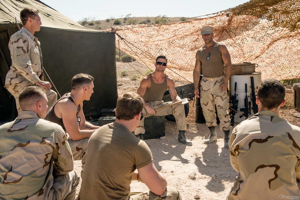 Falcon Studios has released part 3 of their new “Code of Silence” movie today. Sean Zevran and Kyle McMillan are on duty at a deserted post in the desert. It's extremely isolated and Sean admits that he brought Kyle out to the middle of nowhere to help him relax. Sean commands Kyle to put down his weapon and open his mouth.