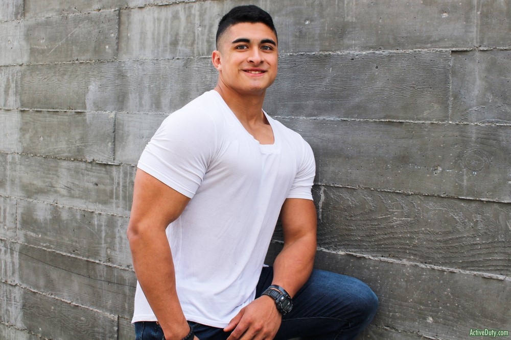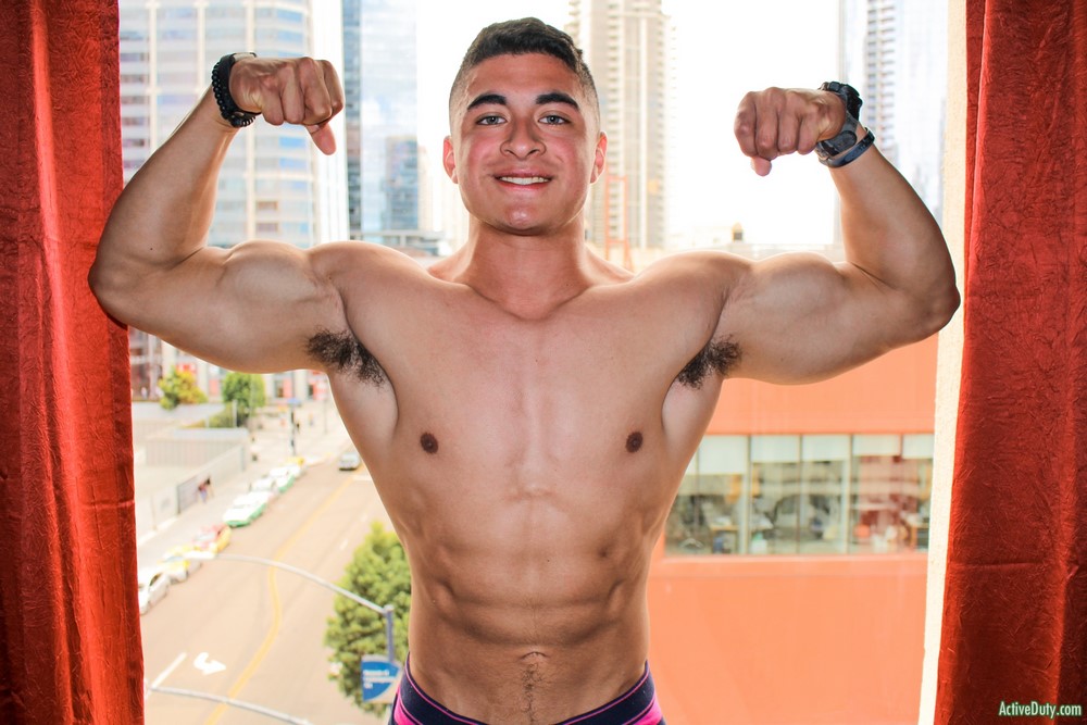 Active Duty released at new solo scene today. Milo Hearst has one amazingly built body with his abs in perfect formation and his smooth tanned skin looks flawless. He spends lots of time at the gym working on that physique and once he dropped all his clothes you can see his hard thick cock ready for stroking. He has smooth shaved balls and uses two hands to stroke his hard dick.