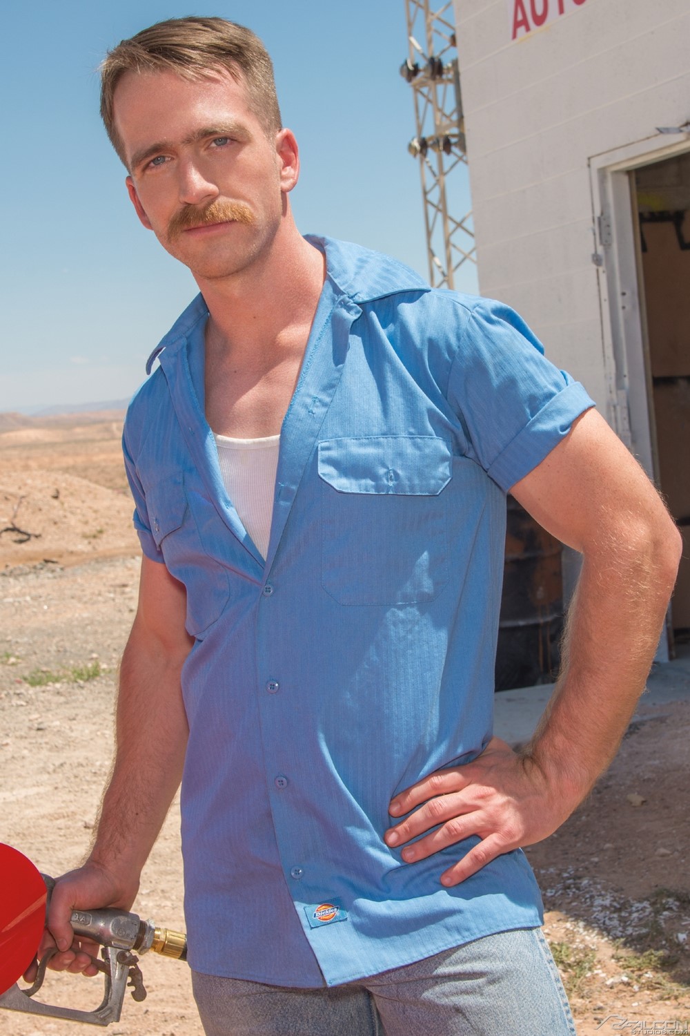Falcon Studios released the first scene today from the anticipated series "Route 69". Fane Roberts and Dustin Holloway have been riding on fumes, luckily the happen upon and lone gas station in the middle of the desert on Route 66. The smoking hot gas attendant equipped with his very own 70s handle bar mustache, Nate Stetson offers to fill them up, the pair eagerly agree. When Nate notices that the car is running a little hot, he has the guys pop the hood where he and the mechanic, Johnny V, take a look at what's wrong. After discovering that the dip stick is missing, Johnny drives the car into the garage where all the suggestive car talk gets Nate revved up.