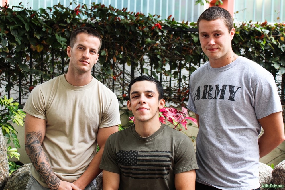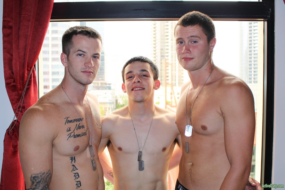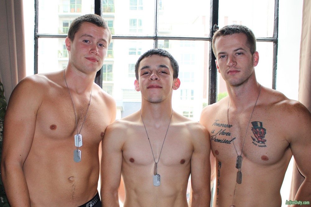 Active Duty released a hot new scene today. Quentin Gainz introduces everybody and the games begin with an amazing 3 way cock blow fest with everyone's mouth stuffed with a hard cock. Damien Nichols has never done anything with men before but Quentin and Billie Starz are breaking him in slowly. Lots of meat to go around with each one of these studs switching from cock to cock and there is never a mouth left behind.