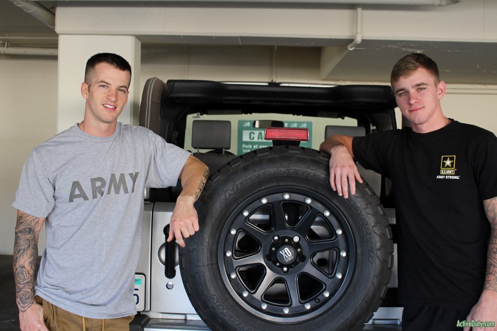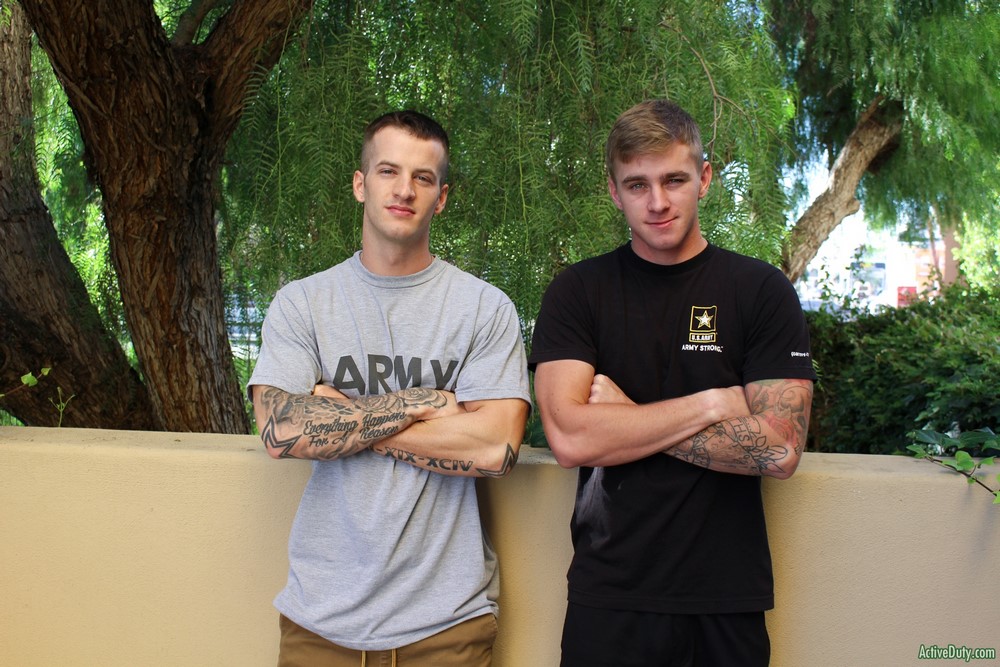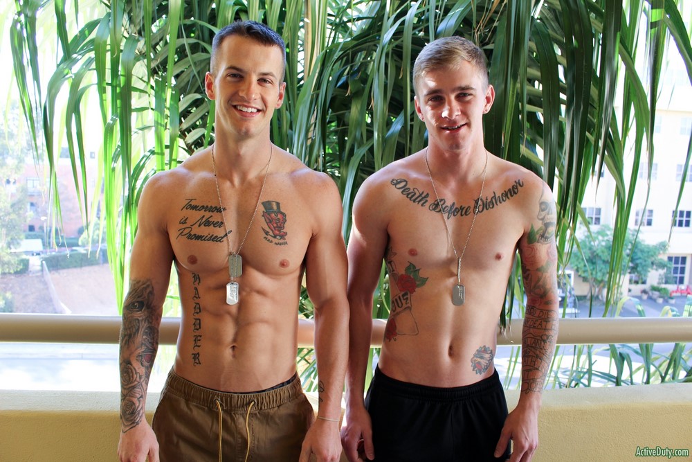 The time has come for Quentin Gainz and Ryan Jordan at Active Duty for a flip-fuck, and they are both eager to get their clothes off and start the fucking. They began with pleasing each other with amazing blow jobs sucking and gagging on one another. The 69 they end up in is mind boggling. Quentin lubes up Ryan's ass with his tongue as he fucks him with it.