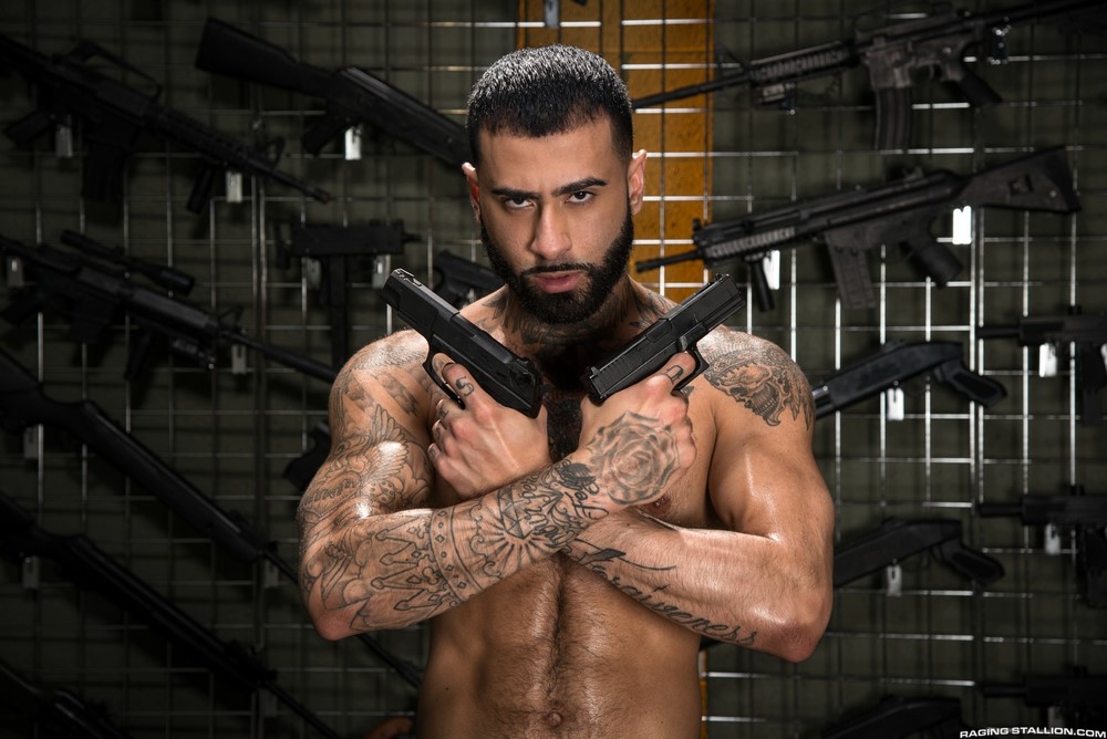 Raging Stallion released “Gun Show” part 3 today. Second Amendment activist Sean Duran is handing out right wing literature at the 'Gun Show' and sets his sights on Rikk York. Sean tries explaining to Rikk that 'cry-baby liberals are gonna take away all our guns!' Rikk likes what he sees in Sean and offers to talk about Sean's concerns in a more private setting. The minute they get alone, Rikk makes his moves on the tatted stud and goes in to give him a kiss. Sean protests at first, not understanding what the hell is going on.