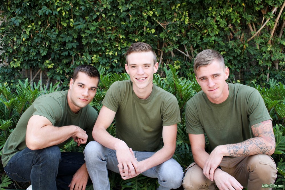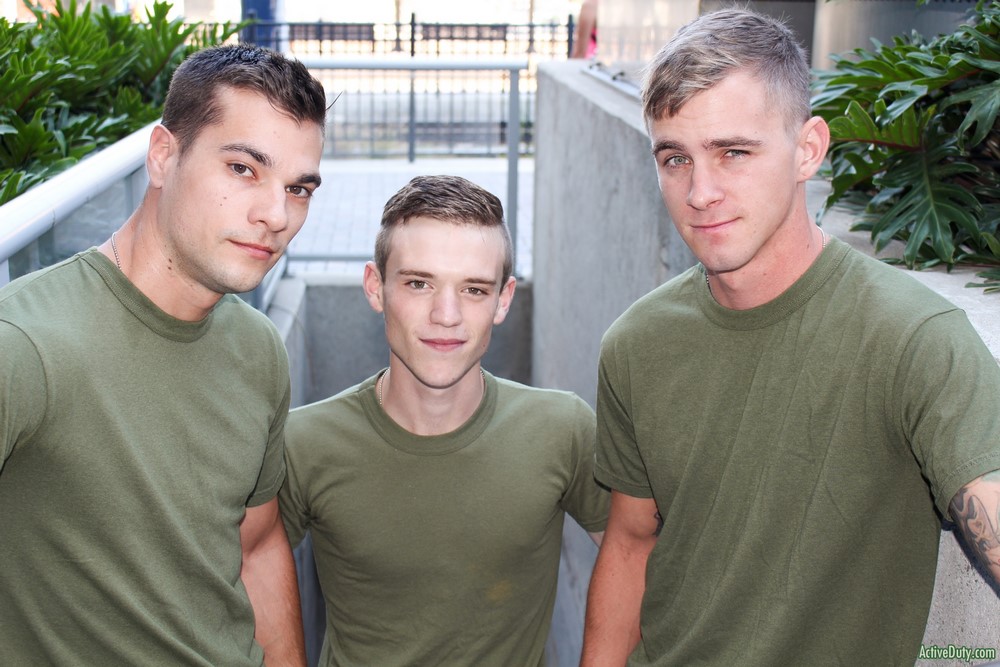 Active Duty released at new scene today. The introduction goes quick and right off the bat they are all blowing each other and fucking. Scott Finn gets man handled most of the time and he loves to gag loud on both of their throbbing hard cocks. Three big dicks all in one place getting slobbered on and put inside some tight manly soldier holes makes for a great scene to watch.