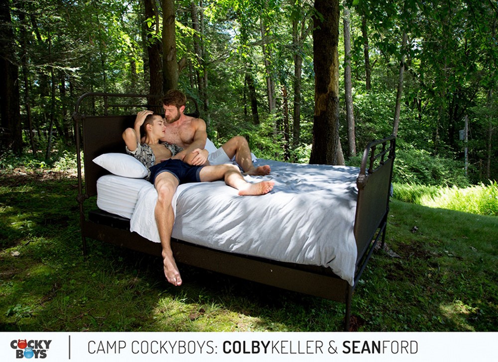 Welcome to Camp CockyBoys! It's a new series that plays on the nickname for the CockyBoys country home and which takes advantage of the biggest ever gathering of models for our 10th Anniversary Pool Party! Or as one veteran CockyBoy says "There's a plethora of delectable creatures all walking around at any time". It's a seemingly endless, fun and joyful summer of swimming, canoeing, hiking, etc as well as quiet times getting to know one another. Then there are the nights by the campfire where the models gather for wienie roasting...and true sex confessions, a challenge instigated by Sean Ford. However it's Sean who is prodded to go first and reveal his hook-up with his longtime crush Colby Keller!