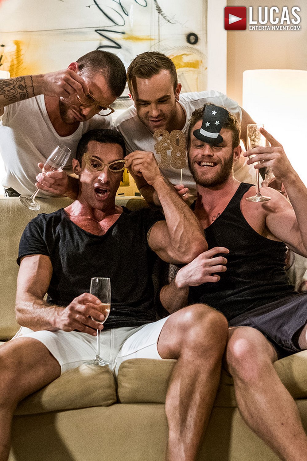 Lucas Entertainment released an “Exclusive Web Scene” today. It’s a group of fuck buddies any gay man would want to spend New Year’s Eve with: Tryp Bates, Shawn Reeve, Nick Capra, and Jackson Radiz. These four guys carry on with a fun and personal New Year’s celebration, and when the clock strikes midnight Tryp and Jackson drop to their knees and begin sucking on Nick and Shawn’s cocks to celebrate 2018. Jackson and Tryp both love the feeling of having their asses stretched by a top cock penetrating them bareback, so Shawn Reeve and Nick Capra take turns hammering their asses until their shoot their loads!